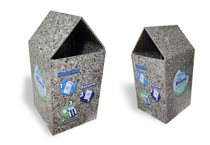 Contenedores Ecológicos de Polialuminio (material resultante del reciclado de los envases posconsumo de Tetra Pak). Con estructura de metal.