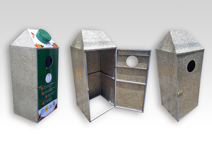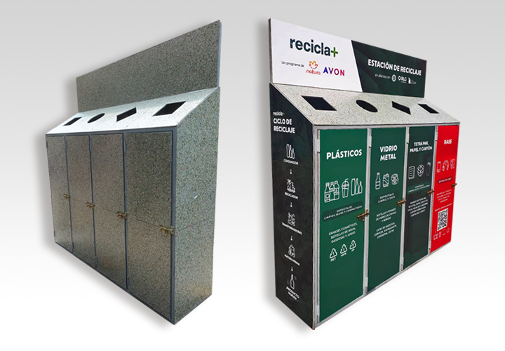 Contenedores Ecológicos de Polialuminio (material resultante del reciclado de los envases posconsumo de Tetra Pak). De 04 cuerpos con estructura de metal. Listo para brandear