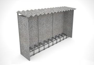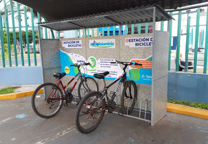 Estacionamiento Ecológicos de Polialuminio (material resultante del reciclado de los envases posconsumo de Tetra Pak). Con estructura de metal.