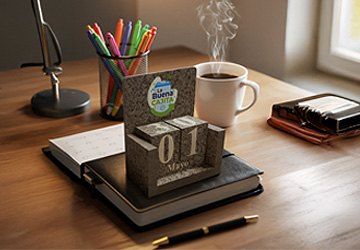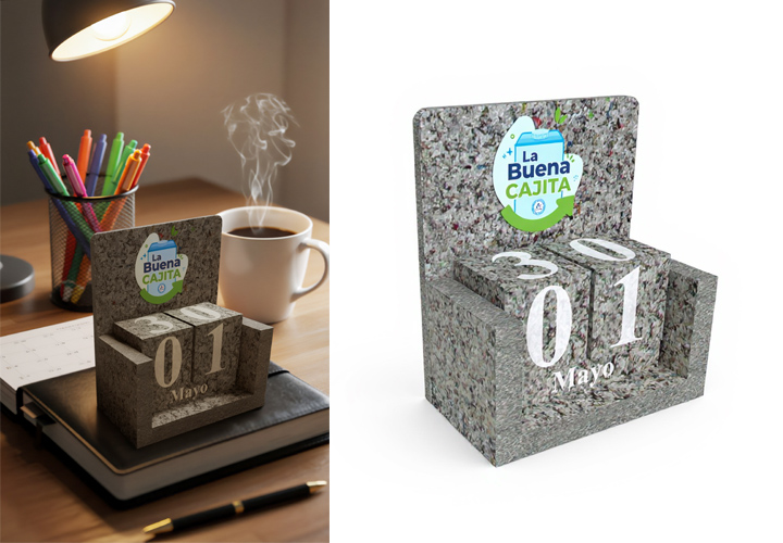 Calendarios Perpetuo de polialuminio (material resultante del reciclado de los envases posconsumo de Tetra Pak). Con piezas hechas de polialuminio, medida aproximada 9.5 x 5.5 cm de base y una altura de 11 cm; ideal para escritorio.
