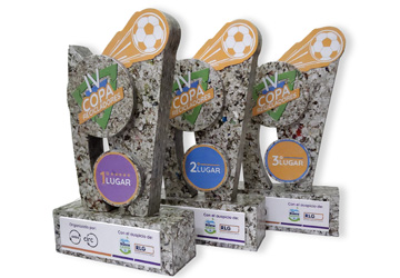 Trofeos de polialuminio (material resultante del reciclado de los envases posconsumo de Tetra Pak). Consta de cuerpo y base rectangular.