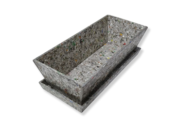 Maceta larga de polialuminio (material resultante del reciclado de los envases posconsumo de Tetra Pak). Fabricado artesanalmente, consta de dos piezas: Maceta con forma trapezoidal y bandeja cuadrada. También se puede usar como base para canasta de regalo