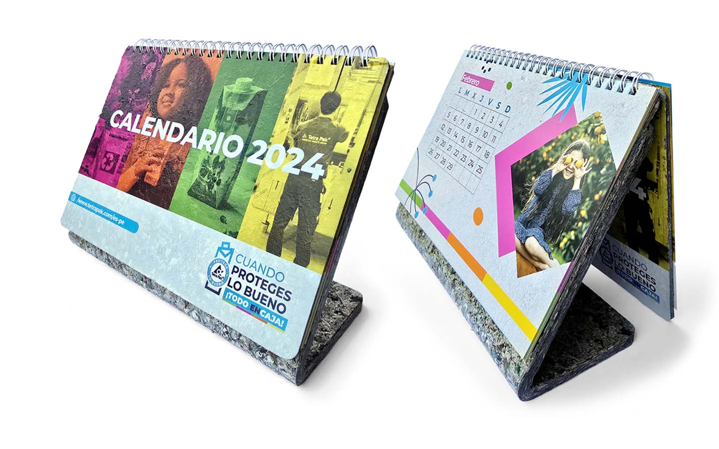 Calendarios con tapa y contratapa de polialuminio (material resultante del reciclado de los envases posconsumo de Tetra Pak).