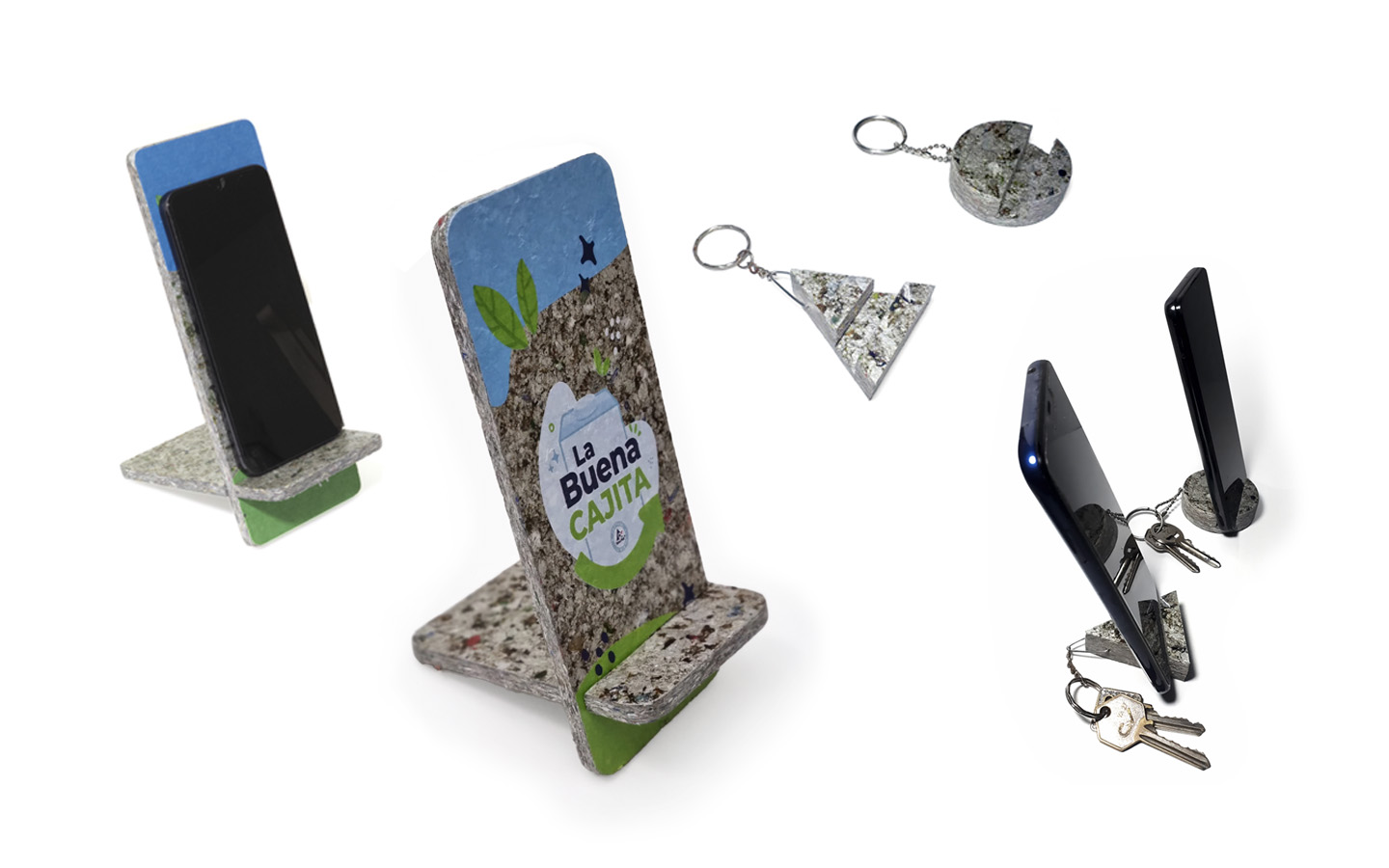Portacelular de polialuminio (material resultante del reciclado de los envases posconsumo de Tetra Pak).