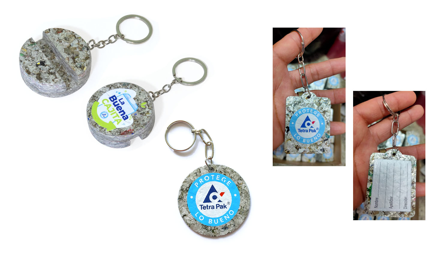 Hang tag y llaveros de polialuminio (material resultante del reciclado de los envases posconsumo de Tetra Pak).