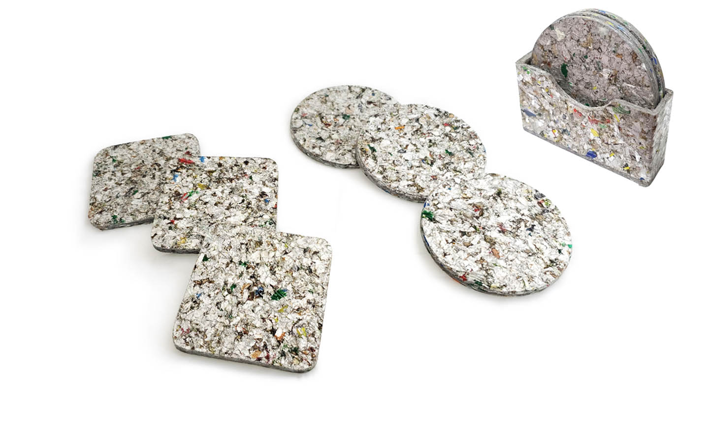 Posavasos cuadrados y redondos, de polialuminio (material resultante del reciclado de los envases posconsumo de Tetra Pak).